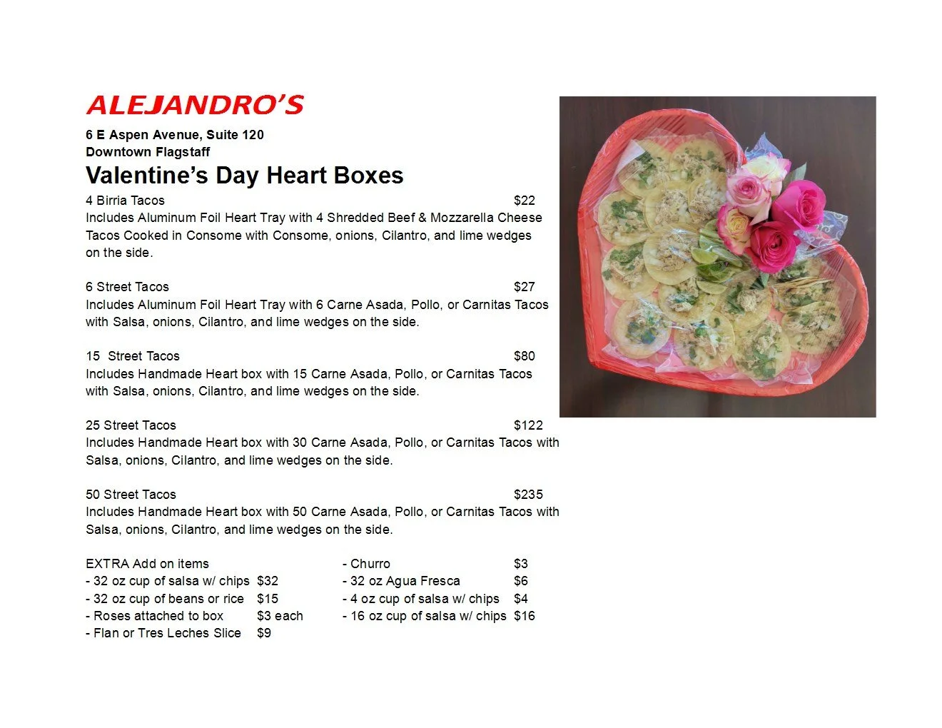 ALEJANDRO’S SPECIALS View fullsize View fullsize View fullsize View fullsize View fullsize Please Call & Order Your Valentine’s Day Heart Box at Alejandro’s, today! (623)694-2108